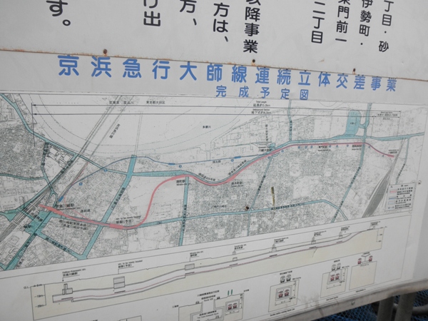 ちょっと見にくいですが、大師線の地下化工事の計画などを書いてある掲示です。よくよく見ると、路線図など地図が古い。JRからの貨物の乗り入れを行っている時代の路線図である。JRからの引き込み線や、川崎大師からの工場への引き込み線もしっかりと記載されている。