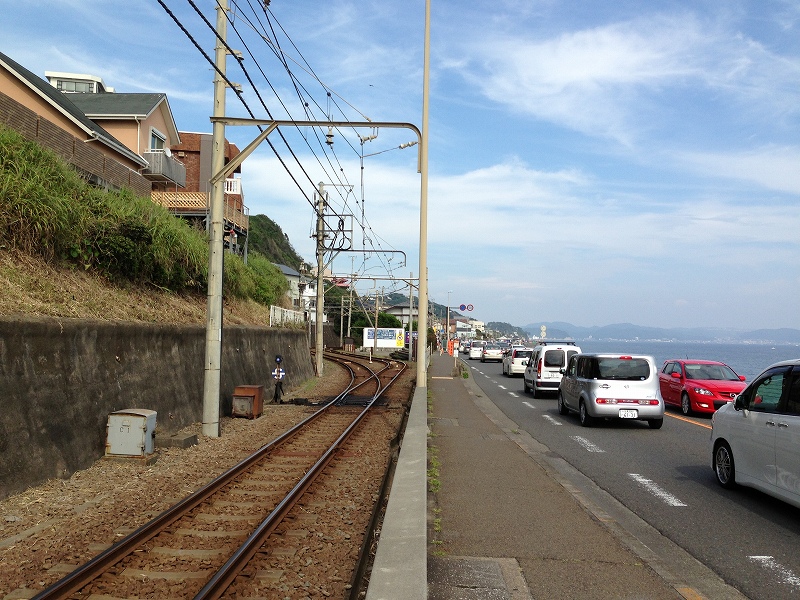 ここから鎌倉行きに乗車し、次の腰越で降りる。この江ノ島~腰越間はほとんどの区間を道路上の併用軌道を通るので、江ノ電は路面電車であると思われがちであるが、特認を得て道路上を走っているのであって、路面電車ではない。