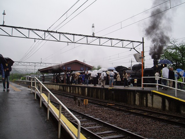 長瀞では「偶然」SLが来る時間で、ホームはSLの乗客などでごった返していた。この日は大雨が降っていっというのにこの盛況ぶりである。