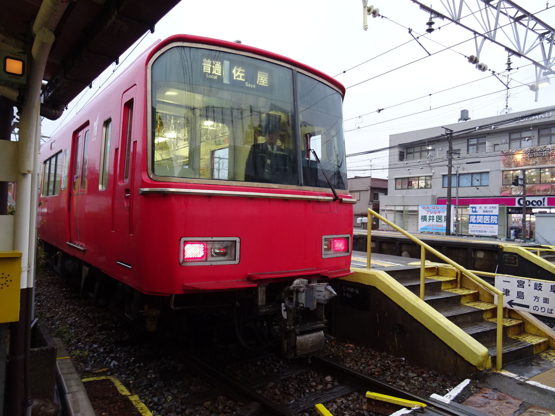 その後、弥冨から須ケ口経由で西枇杷島駅へと移動。ホームが狭すぎて、列車の入線直前までホームに出ることができない、また、ホームいっぱいに電車が停車することで有名な駅である。