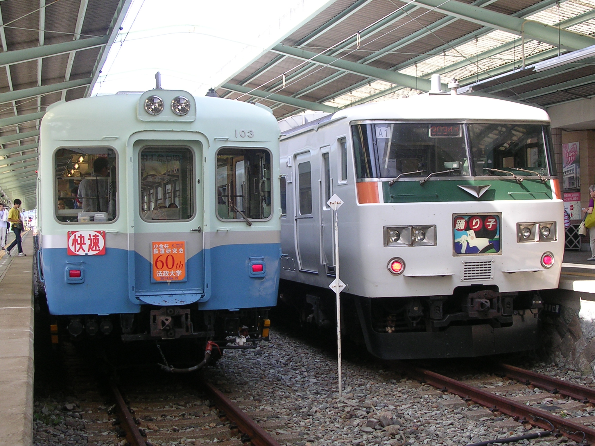 — 法政大学小金井鉄道研究会 (@h_k_tekken) 2014, 6月 15さて、復路では横サボが別のデザインに変わったほか、前種別サボがなぜか“快速”になり、(停車駅が増えるから...かもね)185系での運行となる、“踊り子114号”との並びも撮影できました。